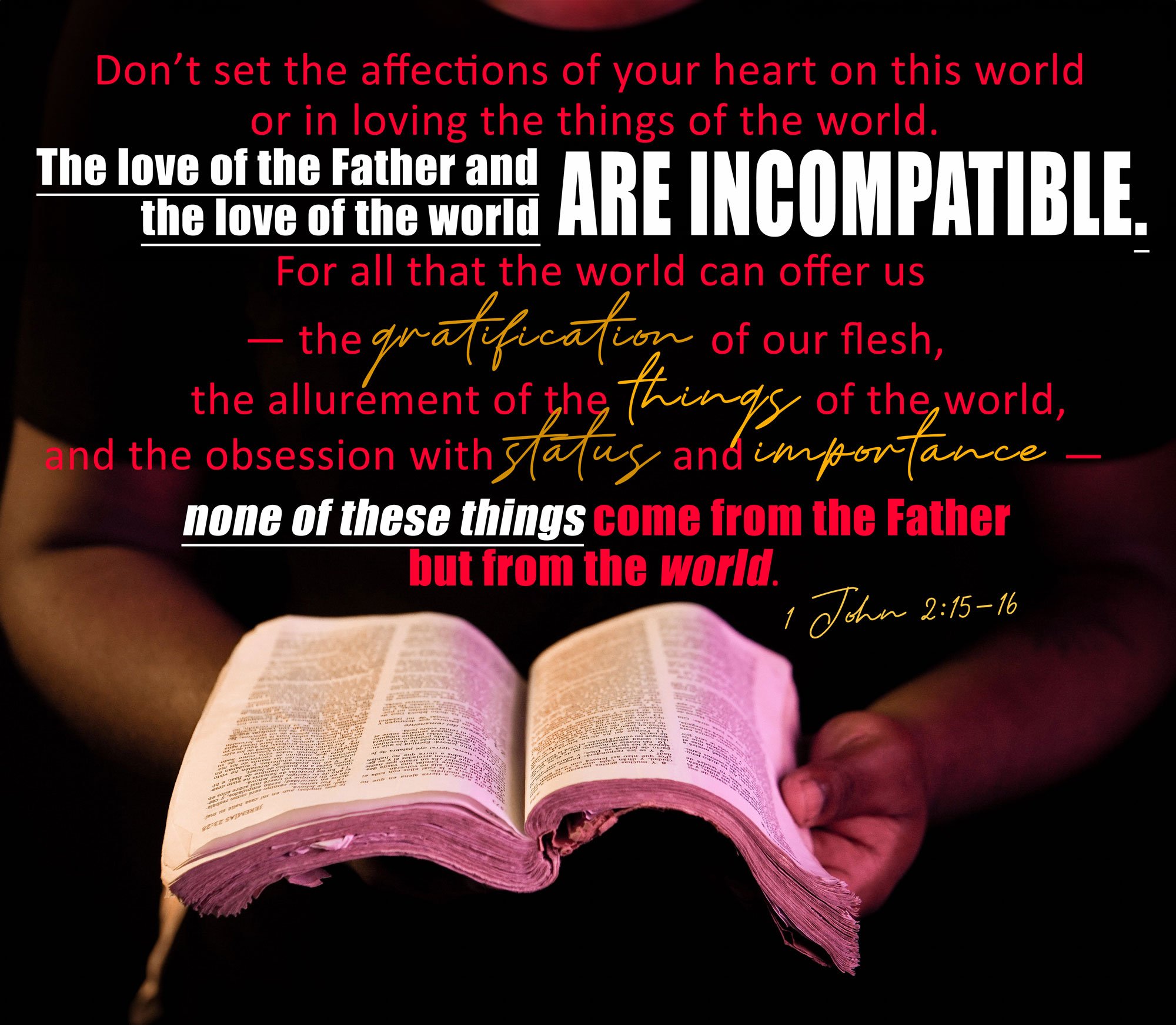”Don’t set the affections of your heart on this world or in loving the things of the world. The love of the Father and the love of the world are incompatible. For all that the world can offer us—the gratification of our flesh, the allurement of the things of the world, and the obsession with status and importance — none of these things come from the Father* but from the world. ”